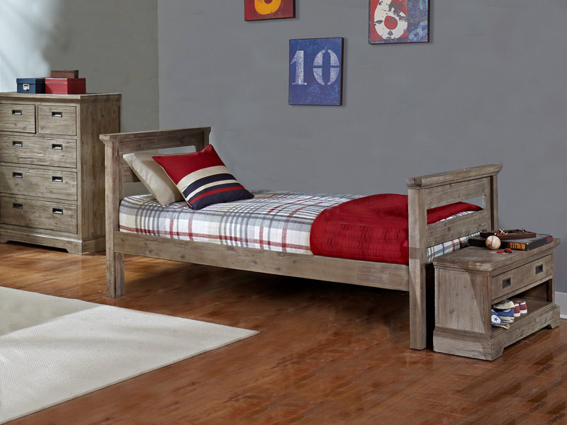 The Cambridge Collection Half Bunk Bed is the epitome of simplicity, with its no-nonsense lines and its bed ends comprised of slatted horizontal planks. Named for another city in Great Britain, the Half Bunk Bed's design combines natural beauty with urban finesse. A slightly styled capital molding tops off the bed ends, framing them just enough to make them look official and finished. The streamlined design contrasts nicely with the Acacia wood's wild grain and color variation, slightly muted with a rustic tan finish, applied in multiple steps for optimal durability. This bed style is available in either Twin or Full and can accommodate either the Cambridge Storage Drawers or the Cambridge Trundle.