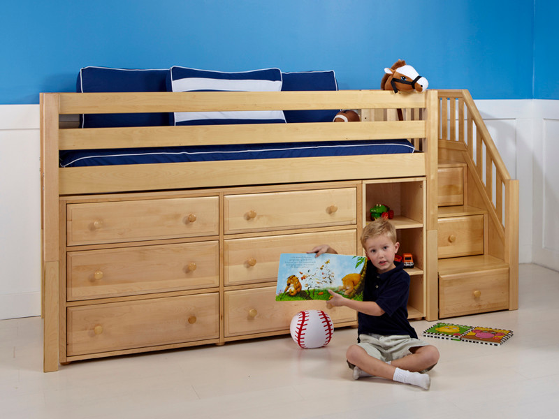 Maxtrix Low Loft with Stairs. Available in chestnut, natural or white wood. Many fabric color options and a wide variety of configurations possible.